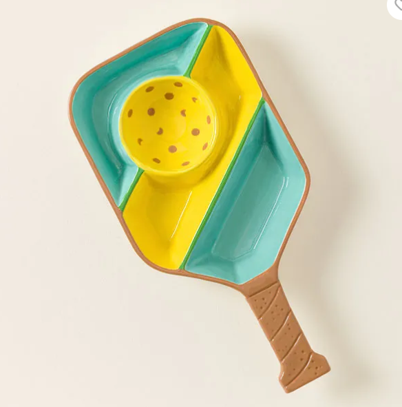 We are obsessed with this pickleball paddle snack tray, which Moms will love. It features an attached pickleball-shaped bowl for dips, sauces, etc.